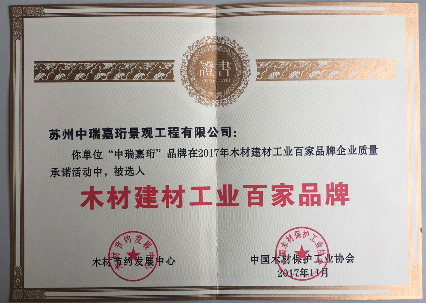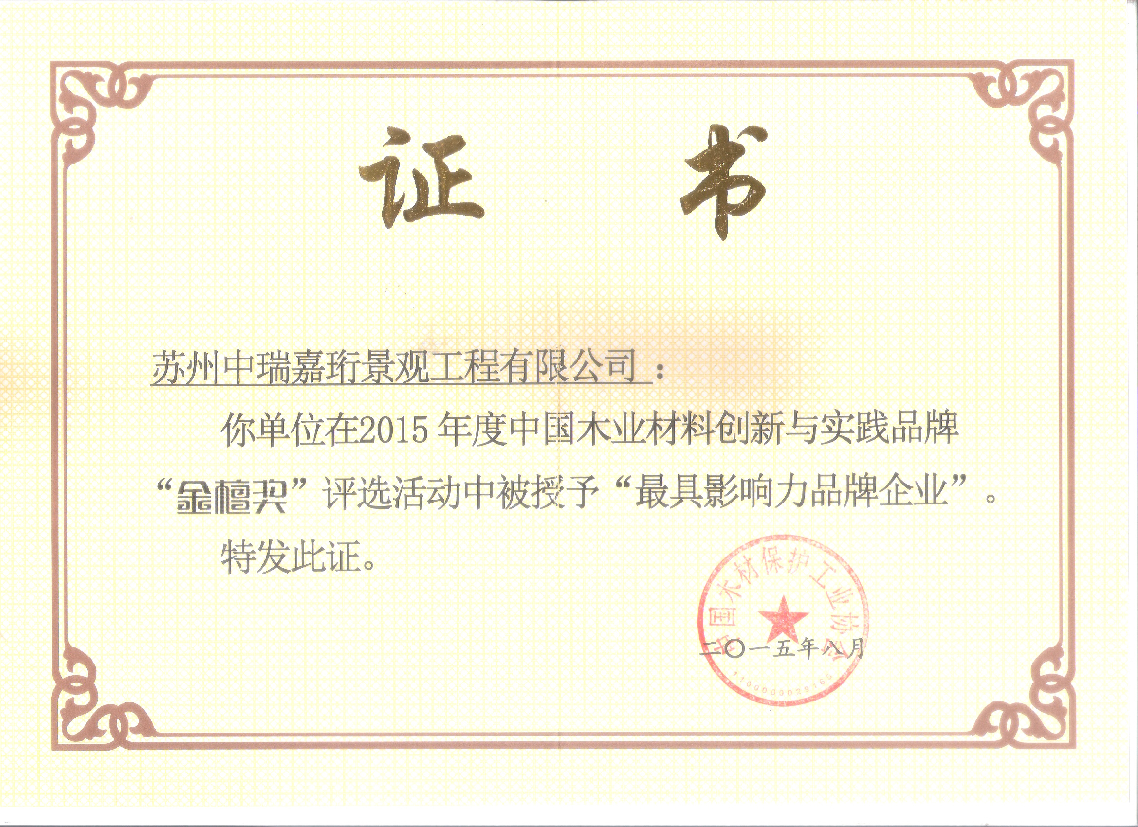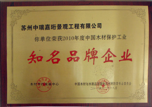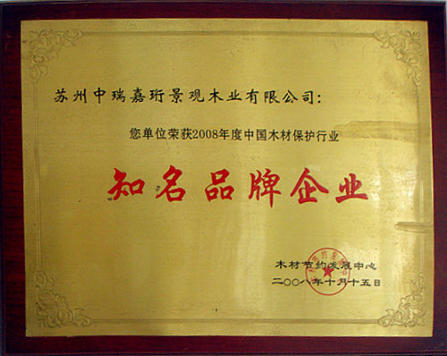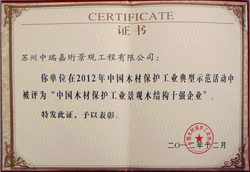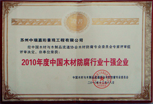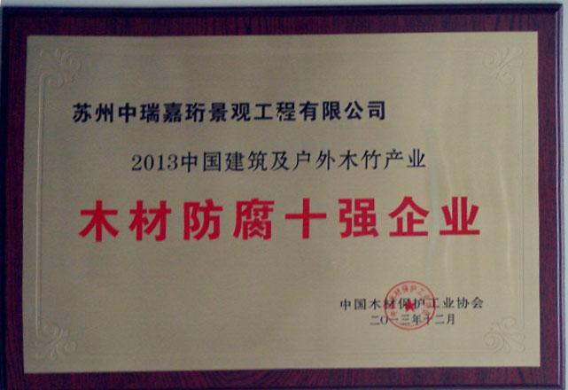 2013年在《中國木材保護工業(yè)協(xié)會》的組織下,我公司榮獲本年度防腐木企業(yè)評選《防腐木材企業(yè)十強》稱號。